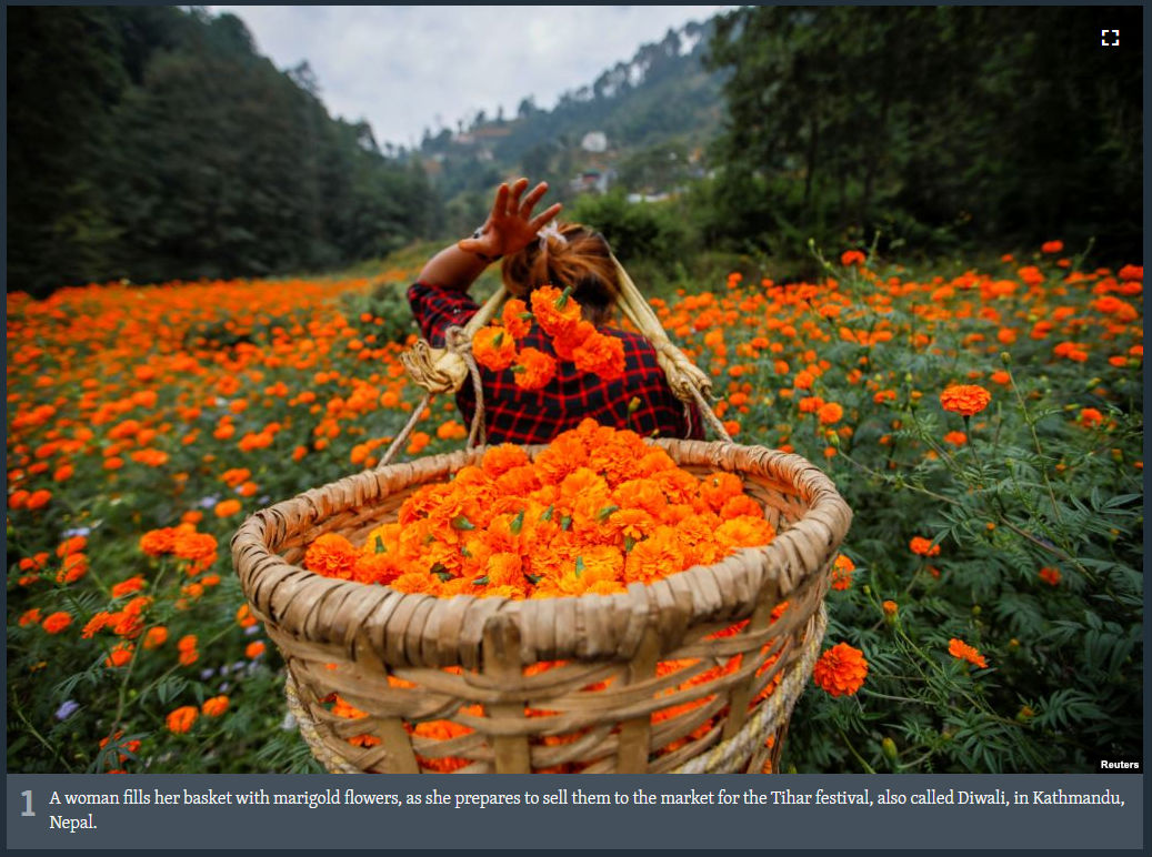 “A woman fills her basket with marigold flowers, as she prepares to sell them to the market for the Tihar festival, also called Diwali, in Kathmandu, Nepal.”
