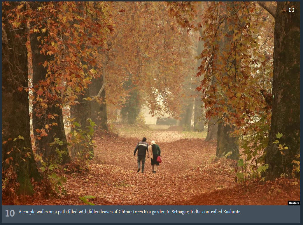 ‘A couple walks on a path filled with fallen leaves of Chinar trees in a garden in Srinagar, India-controlled Kashmir.’