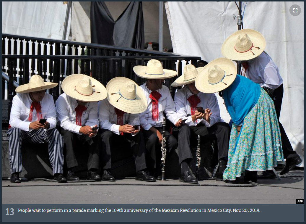 ‘People wait to perform in a parade marking the 109th anniversary of the Mexican Revolution in Mexico City, Nov. 20, 2019.’