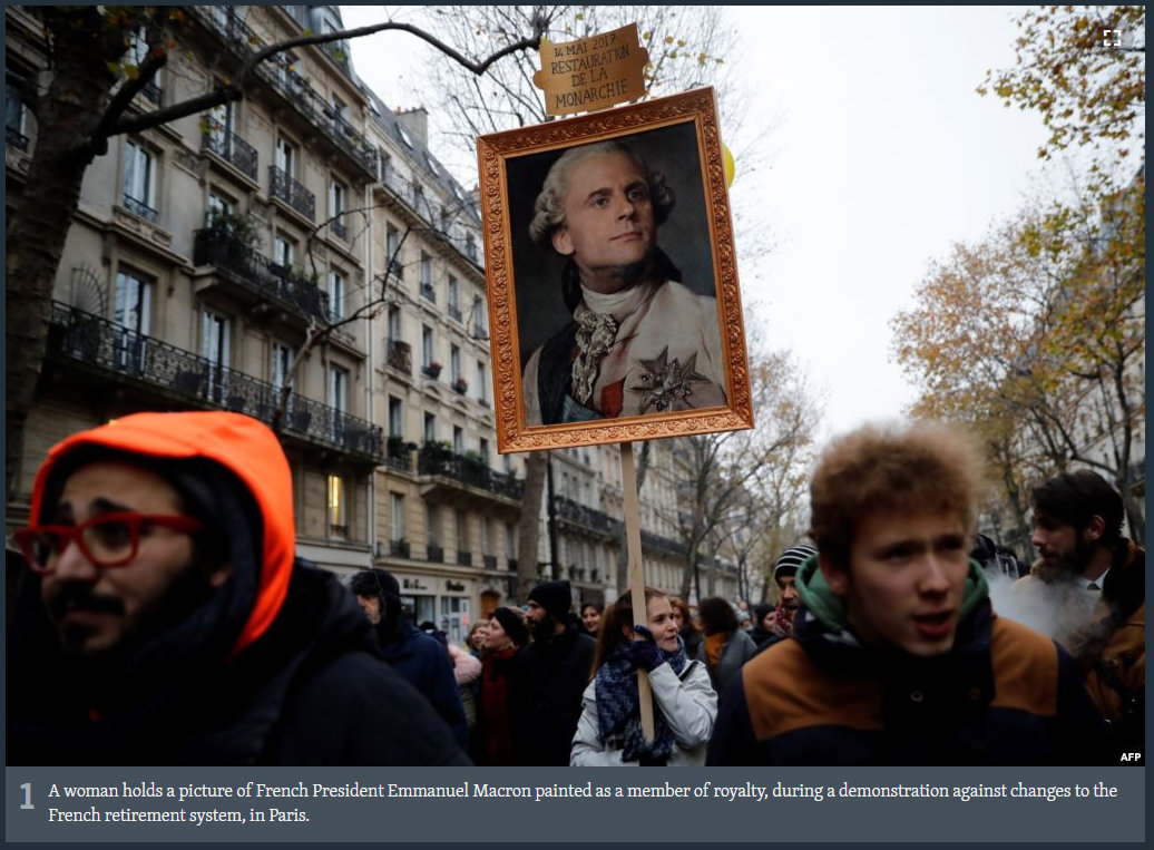 ‘A woman holds a picture of French President Emmanuel Macron painted as a member of royalty, during a demonstration against changes to the French retirement system, in Paris.’
