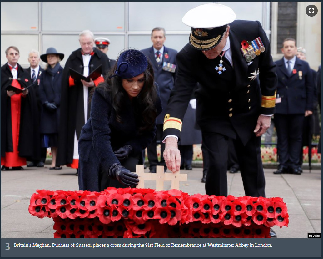 ‘Britain’s Meghan, Duchess of Sussex, places a cross during the 91st Field of Remembrance at Westminster Abbey in London.’