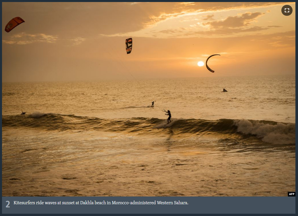 ‘Kitesurfers ride waves at sunset at Dakhla beach in Morocco-administered Western Sahara.’