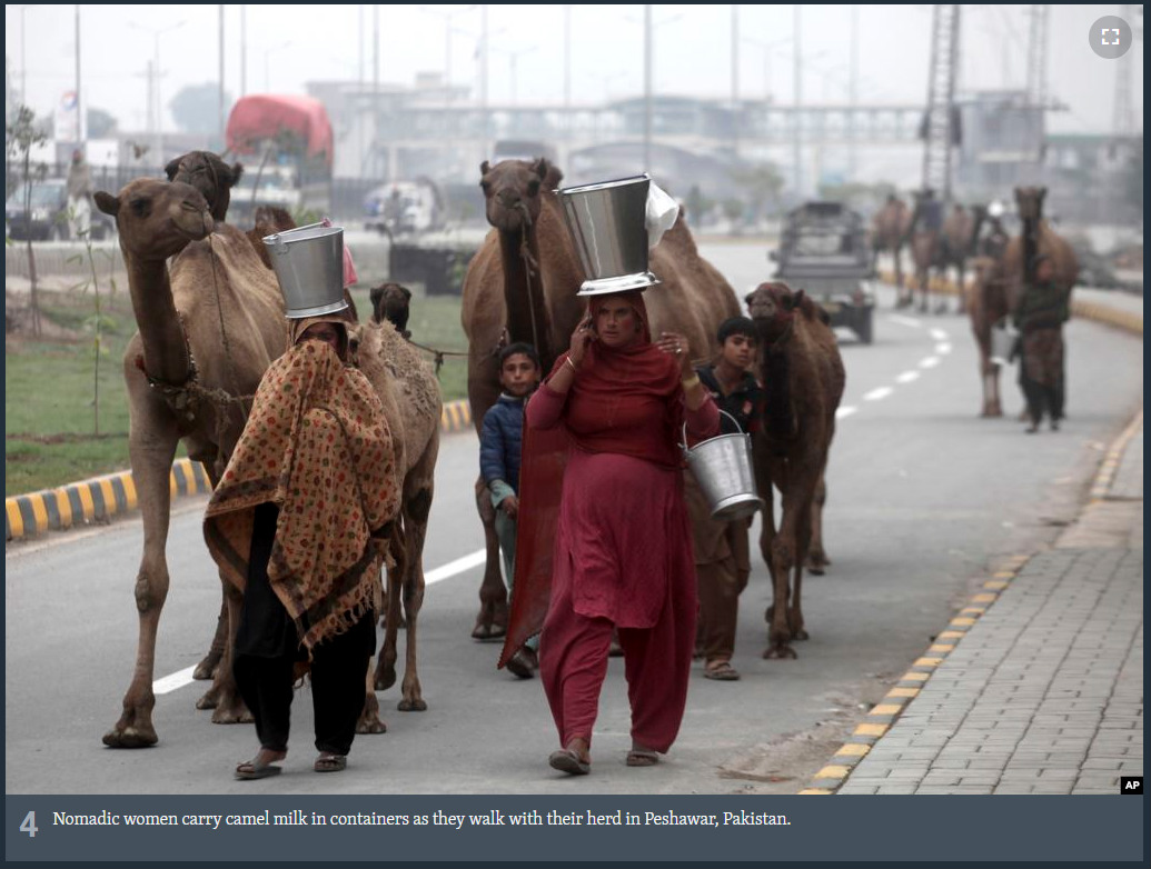 ‘Nomadic women carry camel milk in containers as they walk with their herd in Peshawar, Pakistan.’
