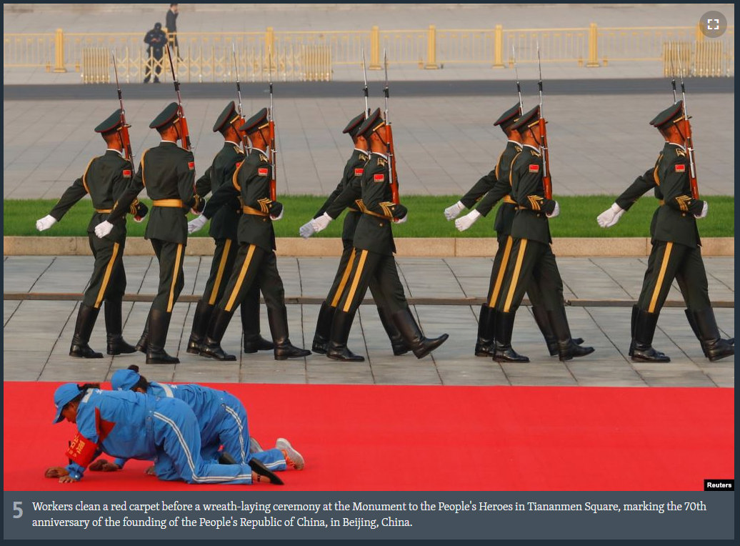 ‘Workers clean a red carpet before a wreath-laying ceremony at the Monument to the People’s Heroes in Tiananmen Square, marking the 70th anniversary of the founding of the People’s Republic of China, in Beijing, China.’