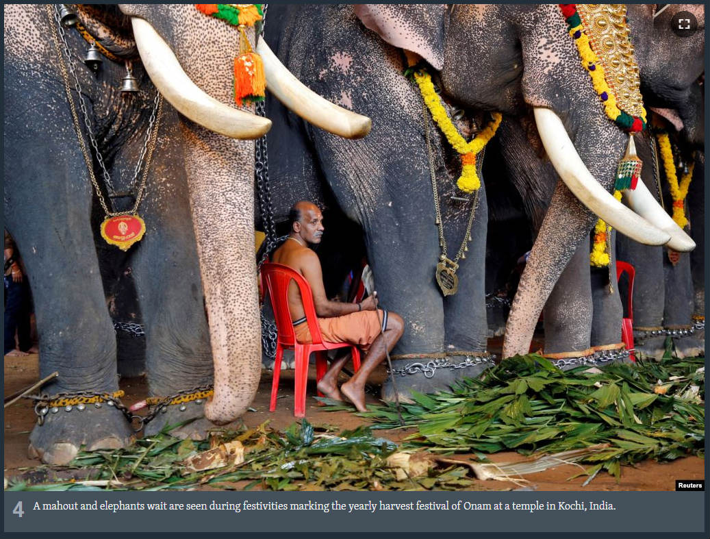 ‘A mahout and elephants wait are seen during festivities marking the yearly harvest festival of Onam at a temple in Kochi, India.’