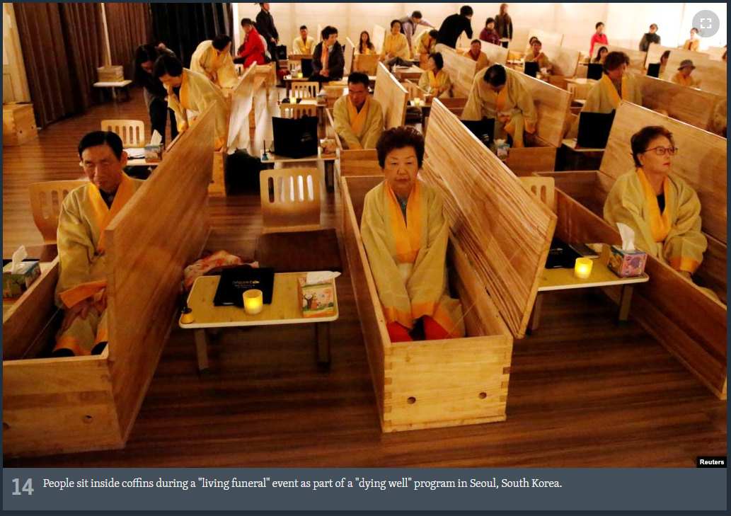 ‘People sit inside coffins during a ‘living funeral’ event as part of a ‘dying well’ program in Seoul, South Korea.’