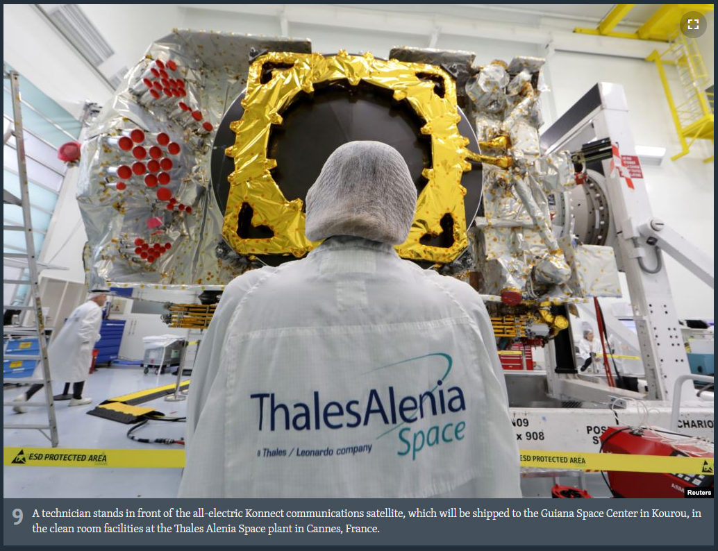 ‘A technician stands in front of the all-electric Konnect communications satellite, which will be shipped to the Guiana Space Center in Kourou, in the clean room facilities at the Thales Alenia Space plant in Cannes, France.’